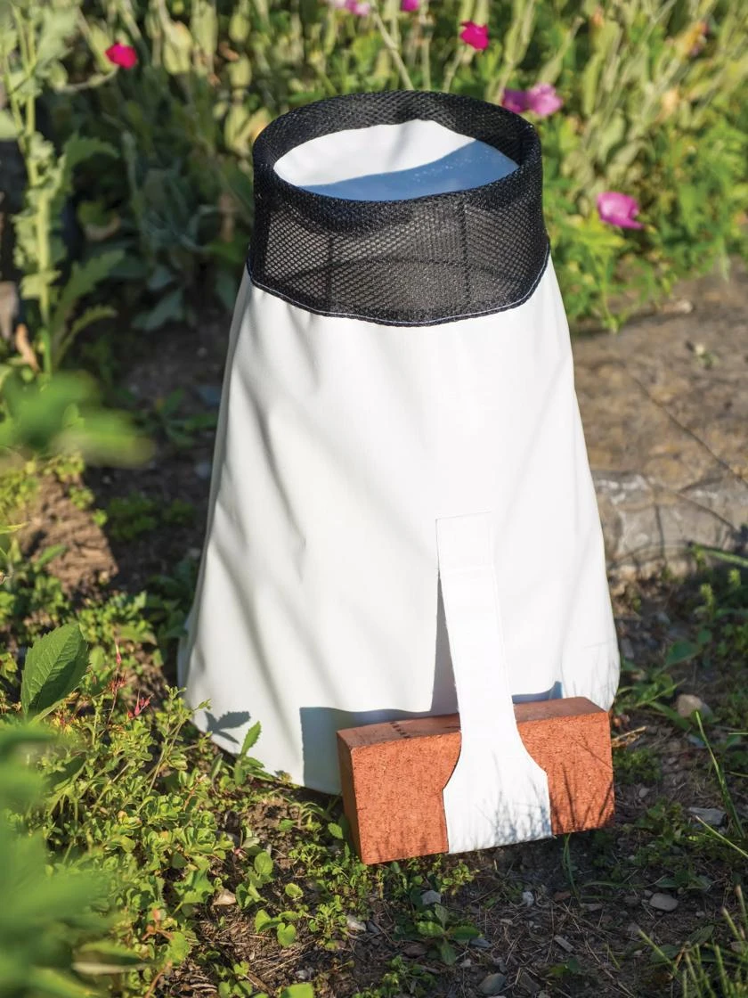 1. The reflective white cover prevents heat build-up, and the mesh top allows heat and moisture to escape, reducing the chance of the plant breaking dormancy too early. (Styrofoam rose cones hold in too much heat and moisture.)